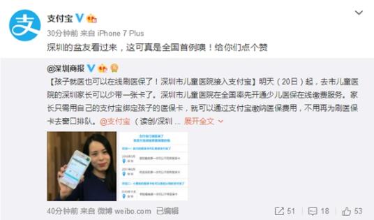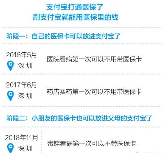 早在 2016 年 5 月,支付寶在深圳就打通了醫保功能,刷支付寶就能用醫保里的錢,去年 6 月升級后,藥店買藥也可以不用帶醫???,如今帶娃看病可以不帶醫保卡更是具有里程碑意義。
