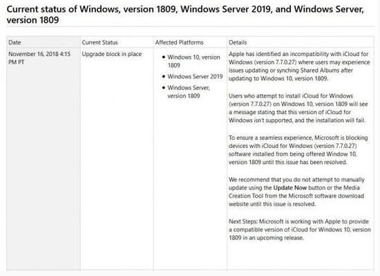 為了確保流暢體驗,微軟已經阻止那些使用 iCloud for Windows(版本 7.7.0.27)的用戶升級 Windows 10 Version 1809。在這個問題沒有得到徹底解決之前,需要使用 iCloud 服務的用戶盡量不要手動升級或者使用媒體創作工具完全安裝。
