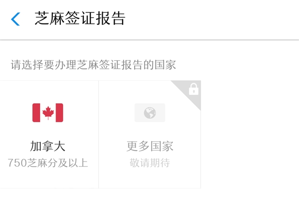 這一功能位于:支付寶 APP——芝麻信用——信用管理——信用簽證,目前列表中已出現(xiàn)加拿大,更多國(guó)家和地區(qū)尚待解鎖。