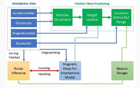 這個系統是自適應的,并不斷重復訓練,從而保證不同用戶和不同的智能手機型號都具有高精確度。其方法是分析終端用戶的定位會話,從而增強系統的知識庫,以便為不同型號的智能手機讀取磁場數據。一旦用戶退出智能手機室內定位應用程序,系統將在云基礎結構中處理記錄的傳感器讀數,并嘗試重構用戶的路徑。這種新的技術稱為“路徑推理”,它基于粒子濾波和形狀匹配。它允許研究人員在該區域的磁圖上添加新的信息層。因此,同一款智能手機的后續定位會話具有更高的準確率。
