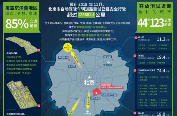 截至 2018 年 11 月,北京自動駕駛車輛道路測試已經安全行駛超過 12.56 萬公里,開放了 44 條共 123 公里測試道路,覆蓋京津冀地區城市、鄉村、高速等 85% 交通場景。其中位于北京亦莊的測試道路達到 74.4 公里,成為目前國內最長的自動駕駛測試道路。