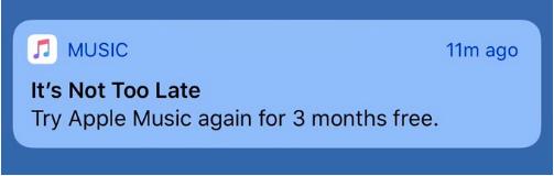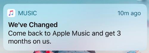 在過(guò)去一周中,蘋(píng)果向大量iOS用戶發(fā)出推送消息,提供給用戶額外的3個(gè)月AppleMusic免費(fèi)試用。這些消息似乎是專門為那些AppleMusic老用戶準(zhǔn)備的,這些用戶曾經(jīng)訂閱了AppleMusic,但后來(lái)取消了訂閱,或者是經(jīng)過(guò)第一次3個(gè)月免費(fèi)試用后,沒(méi)有選擇訂閱而直接離開(kāi)的。
