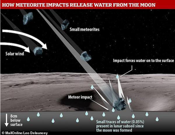 當一顆隕星高速撞擊月球表面,它一般會在撞擊的一瞬間由于高溫而蒸發掉,同時撞擊將產生一次強烈的沖擊波在月壤中傳播。如果一次撞擊的規模足夠大,這種沖擊波可能會造成表層干粉狀月壤層產生裂隙,并讓下層較為潮濕的含水層中的水分子得以釋放。