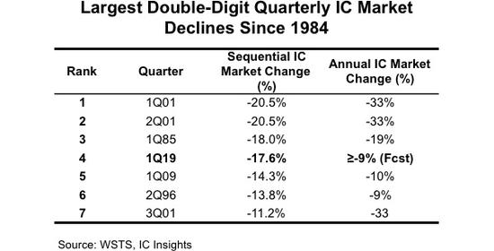 更悲觀的是,1984 年以來,芯片行業如果第一季度跌幅超過 10%,則全年都會下跌至少9%,IC Insights 認為今年也不會例外。