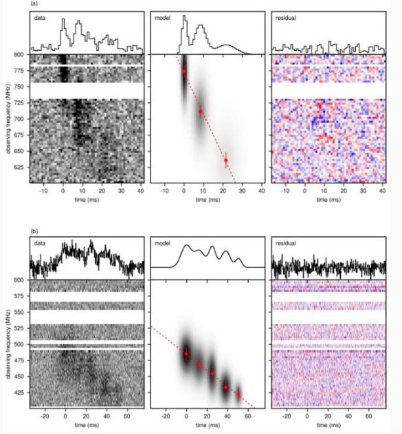 色散量(DM)的擬合顯示 FRB 180916.J0158+65 的 DM 值為 349 pc cm^-3。由于銀河系以及銀暈電子分布的不確定性,我們還無法排除這個重復暴是否真的來自銀河系外。另外 FRB 181030.J1054+73 的 DM 值僅有 103.5 pc cm^-3,是目前探測的 DM 最小的 FRB。即便如此,銀河系貢獻的 DM 僅有 32-40 pc cm^-3,依然表明這個 FRB 來自于銀河系外。低 DM 的 FRB 可用來研究近鄰星系的電子分布情況。