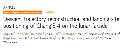 北京時間9月24日23時,國際頂級學術期刊《自然》(Nature)子刊《自然-通訊》(Nature Communications)在線發表了一篇來自中國科學家的成果:Descent trajectory reconstruction and landing site positioning of Chang’E-4 on the lunar farside。中國科學院國家天文臺副臺長、月球與深空探測研究部主任李春來領導的“嫦娥四號”研究團隊,精確定位了“嫦娥四號”的著陸位置,并對“嫦娥四號”的落月過程進行了重建。