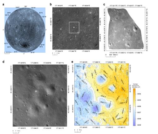 隨后,研究團隊利用由兩臺攝像機組成的導航攝像機(NCAM)獲取的雙目立體圖像,精確計算出“嫦娥四號”的著陸點為東經177.5991°,南緯45.4446°,高程-5935米。該著陸點位于一個退化撞擊坑的緩坡上,距離北邊一個直徑25米的撞擊坑邊緣很近,且著陸點周圍共有五個撞擊坑。