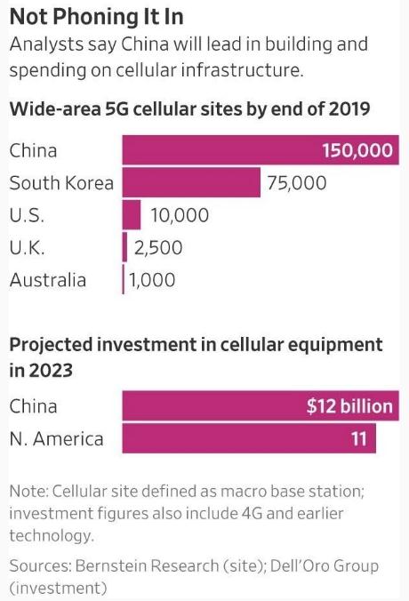 伯恩斯坦公司的萊恩說,到今年年底,中國將有至少 15 萬個(gè) 5G 廣域基站可供公眾使用,這一數(shù)字將超過任何其他國家。伯恩斯坦公司估計(jì),韓國將以 7.5 萬個(gè)此類基站位居第二,而美國到今年年底將擁有 1 萬個(gè) 5G 基站。