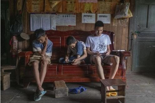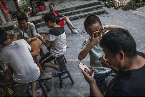 村里的孩子們正在拿智能手機(jī)上網(wǎng)打游戲。