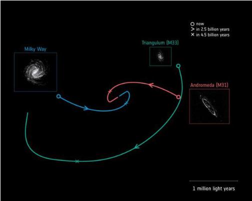 未來三個螺旋星系的軌道軌跡:藍色為銀河系;紅色為仙女座星系,也被稱為 M31;綠色為三角座星系,也被稱為 M33。一項基于歐洲蓋亞任務觀測數據的研究表明,銀河系和仙女座星系將在 45 億年后發生碰撞。