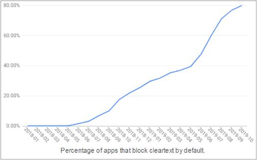 谷歌方面表示,截至 2019 年 10 月,五分之四(80%)可通過官方 Play 商店下載的 Android 應(yīng)用程序正在使用 HTTPS 加密各自的網(wǎng)絡(luò)流量。而對于直接針對 Android 9 的應(yīng)用,該數(shù)字甚至更高,達(dá)到 90%。這意味著進(jìn)入或離開這些應(yīng)用程序之一的流量是經(jīng)過加密的,第三方無法攔截或讀取。