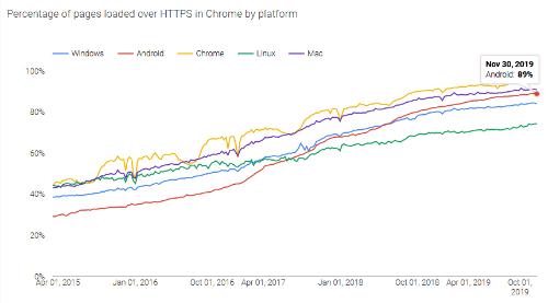 根據(jù)該公司的透明度報告,Chrome 內(nèi)的 HTTPS 使用率現(xiàn)在介于 85% 和 95% 之間,具體取決于平臺。