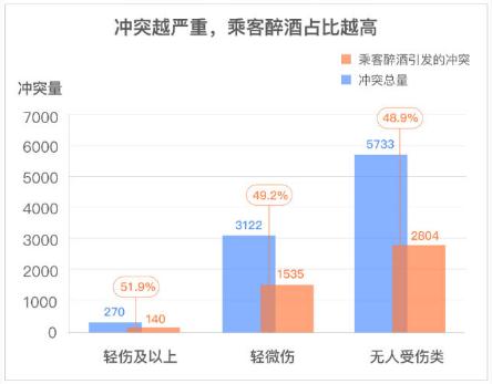 報告顯示,在越嚴重的沖突中,乘客醉酒占比越高。2019 年1-3 季度,有人受輕傷及以上的沖突投訴中,由醉酒引發的占比 51.9%;有人受輕微刮傷的沖突投訴中,由醉酒引發的占比 49.2%;言語沖突投訴中,由醉酒引發的占比 48.9%。