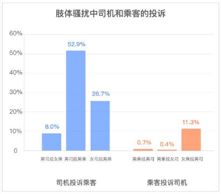 乘客醉酒乘車也可能導致言語或肢體類性騷擾投訴,其中,大部分是言語騷擾投訴,但是在少量的肢體騷擾投訴中,司機投訴乘客占比 87.6%,乘客投訴司機占比 12.4%。值得注意的是,男司機投訴男乘客肢體騷擾的比例占 52.9%。
