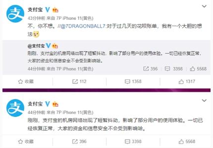 對(duì)此,支付寶回應(yīng)稱:“剛剛,支付寶的機(jī)房網(wǎng)絡(luò)出現(xiàn)了短暫抖動(dòng),影響了部分用戶的使用體驗(yàn)。一切已經(jīng)恢復(fù)正常,大家的資金和信息安全不會(huì)受到影響哈。”