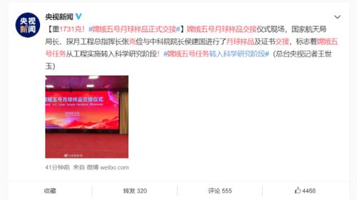據央視報道,嫦娥五號月球樣品交接儀式現場,國家航天局局長、探月工程總指揮長張克儉與中科院院長侯建國進行了月球樣品及證書交接,標志著嫦娥五號任務從工程實施轉入科學研究階段。