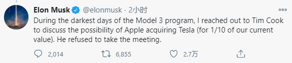馬斯克在推文中表示,在公司開發(fā)特斯拉 Model 3 的“最黑暗日子”里,自己曾聯系蘋果商討收購特斯拉的可行性。馬斯克表示,他想要以約600 億美元的估值將特斯拉賣給蘋果,這僅為當前特斯拉市值的十分之一。