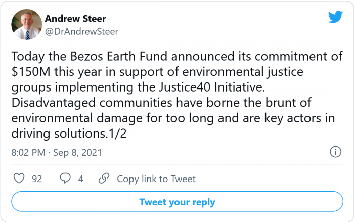 此前,貝佐斯因為沒有為處于氣候危機前線的社區(qū)撥出足夠的資金而遭到活動人士的抨擊。在去年的第一輪捐贈中,該基金向環(huán)保組織撥款 7.91 億美元。其中大部分資金都流向了大型環(huán)保組織,包括世界野生動物基金會(WWF)和環(huán)境保護基金會(EDF),這些組織的資金比注重氣候正義的組織更雄厚。