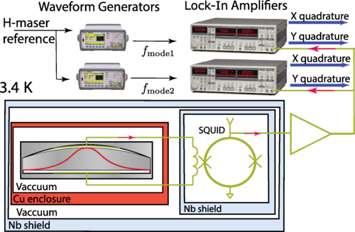 BAW 裝置被連接到一個被稱為 SQUID 的超導量子干涉裝置上,該裝置對來自石英 BAW 的低電壓信號起著極其敏感的放大器作用。這個組件被放置在多個輻射防護罩中,以保護其不受雜散電磁場的影響,并被冷卻到低溫,以便在 SQUID 放大器的幫助下將石英晶體的低能量聲波振動檢測為大電壓。