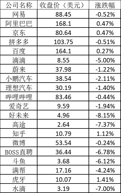 其它熱門中概股普遍下跌,其中 BOSS 直聘下跌 6.78%,斗魚下跌 6.12%,滴滴下跌 5.00%,滿幫下跌 4.24%,嗶哩嗶哩下跌 0.44%,知乎上漲 1.12%,百度上漲 0.27%。