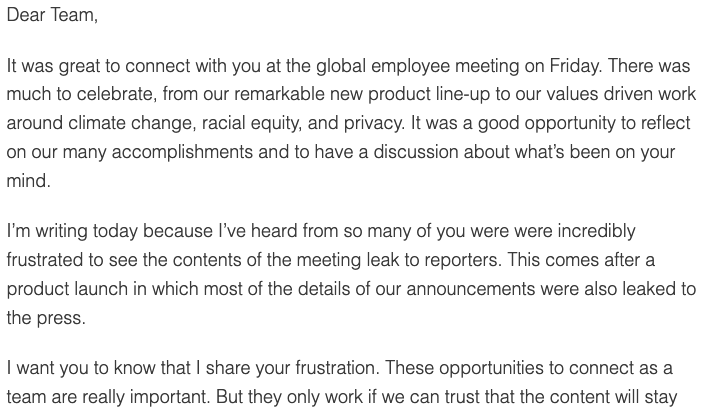 另外,蘋果在 9 月 17 日舉行了一場全體員工大會,要求對未接種疫苗的員工進行頻繁檢測,但沒有強制要求接種疫苗。不料,這場大會的內容也被泄露給了媒體。