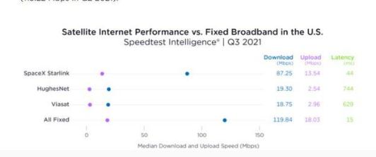 在美國,希望使用衛星互聯網服務的消費者發現,與 2021 年第二季度相比,第三季度網速基本持平。星鏈的下載速度中值從 2021 年第二季度的 97.23 Mbps 降至 2021 年第三季度的 87.25 Mbps,這可能是增加更多客戶所致。