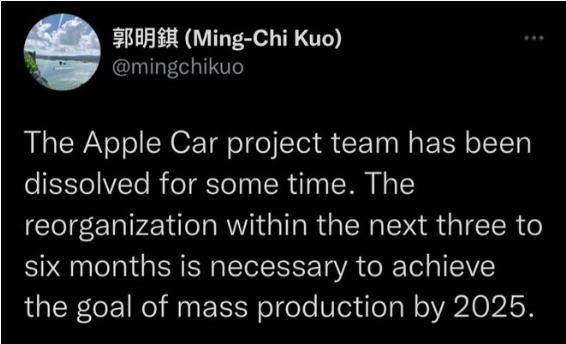 天風(fēng)國際分析師郭明錤在推特表示,此前爆料已久的蘋果 Apple Car 團(tuán)隊已經(jīng)解散了一段時間。如果想在 2025 年量產(chǎn) Apple Car,需要在 3~6 個月內(nèi)進(jìn)行團(tuán)隊重組。