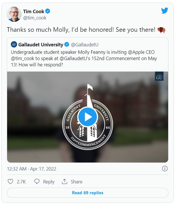 蘋果公司首席執(zhí)行官蒂姆-庫克已經(jīng)同意在加拉德特大學(xué)的畢業(yè)典禮上發(fā)表演講,加拉德特大學(xué)是一所專門教授聾人、聾盲人和聽障學(xué)生的教育機構(gòu)。