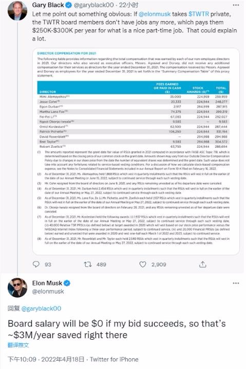 特斯拉 CEO 埃隆?馬斯克(Elon Musk)今日表示,如果他成功收購(gòu) Twitter,意味著公司將不再需要董事會(huì),每年相當(dāng)于為 Twitter 節(jié)省約 300 萬(wàn)美元費(fèi)用。