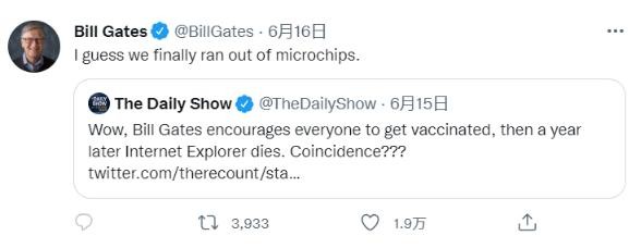 微軟永久關閉 IE 瀏覽器,公司創始人比爾?蓋茨(Bill Gates )在個人社交媒體推特上開玩笑說,微軟之所以關閉 IE 瀏覽器是因為“微芯片被用完了”。