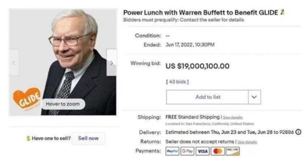 現(xiàn)年 91 歲的巴菲特通過于 2000 年開始的午餐拍賣活動(dòng)為格萊德基金會(huì)籌集了超過 3420 萬美元(約 2.24 億元人民幣),自 2008 年以來,每次中標(biāo)者出價(jià)都超過 100 萬美元。據(jù)格萊德基金會(huì)介紹,2022 年將是最后一屆巴菲特慈善午餐拍賣活動(dòng)。