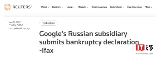 據(jù)路透社報(bào)道,今日,俄羅斯國(guó)際文傳電訊社援引法庭在線文件稱,Alphabet 旗下谷歌的俄羅斯子公司已提交破產(chǎn)聲明。