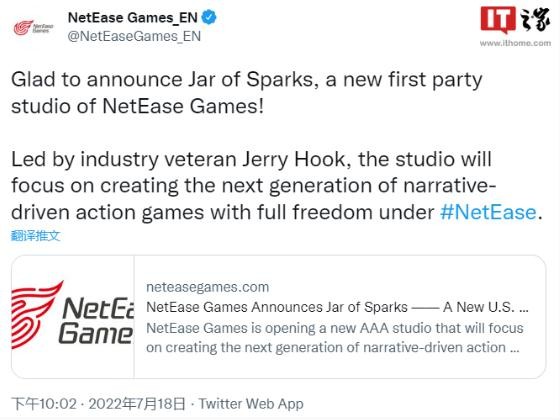 網易網絡游戲部門網易游戲宣布,正在開設一個新的 AAA 工作室 Jar of Sparks,將專注于創造下一代敘事驅動的動作游戲。