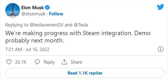 據報道,特斯拉 CEO 埃隆·馬斯克發推稱,整合游戲平臺 Steam 的工作取得進展,下個月可能就會演示。