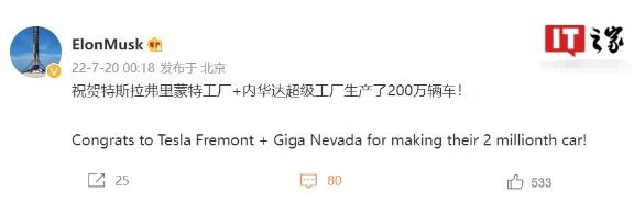 馬斯克表示 特斯拉弗里蒙特工廠和內(nèi)華達(dá)超級(jí)工廠已生產(chǎn)200萬輛車 09:56:36