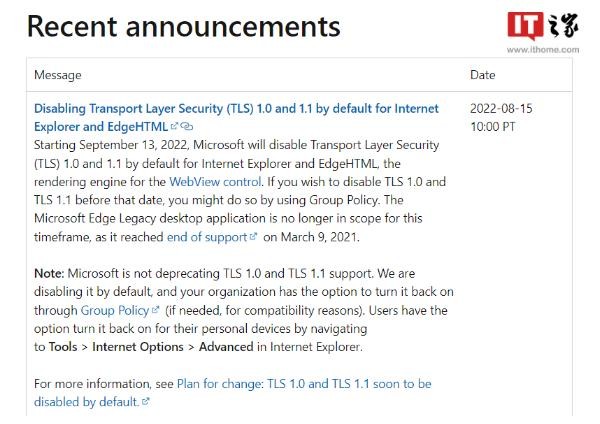 微軟 8 月 15 日公布了更新計(jì)劃,將于 2022 年 9 月 13 日在 Internet Explorer 和 EdgeHTML(舊版 Edge 瀏覽器的內(nèi)核)中禁用 WebView 控件的 TLS 1.0 和 1.1(傳輸層安全協(xié)議)。
