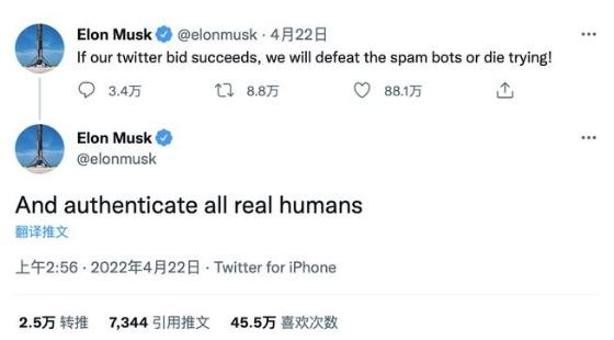 推特平臺的虛假賬戶一直是馬斯克的“心頭大患”。在推特同意被收購之前,馬斯克就曾大張旗鼓地表示,想在推特推行實名制。4 月 22 日他發布推文稱,“如果能夠成功收購推特,將打擊所有的機器人賬號,驗證所有的真人賬號。”
