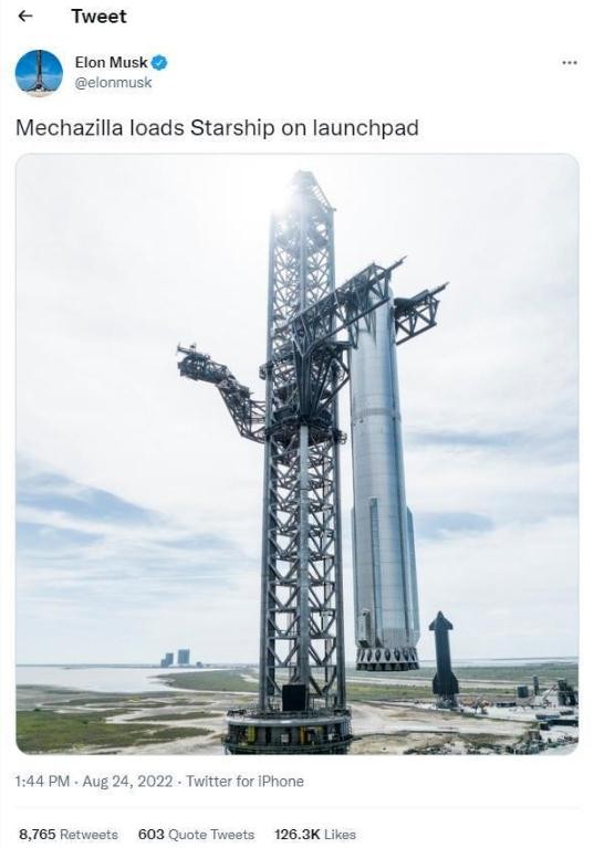 8 月 23 日,SpaceX 用 Mechazilla 巨型機械臂將 7 號超級重型助推器放置至 143 米高的發射塔。公司首席執行官埃隆·馬斯克(Elon Musk)在社交媒體推特上慶祝了這一工作。他發布了一張關于機械臂牢牢抓住 7 號超級重型助推器的照片,并配文稱,“Mechazilla 已經將星際飛船裝載到發射臺”。