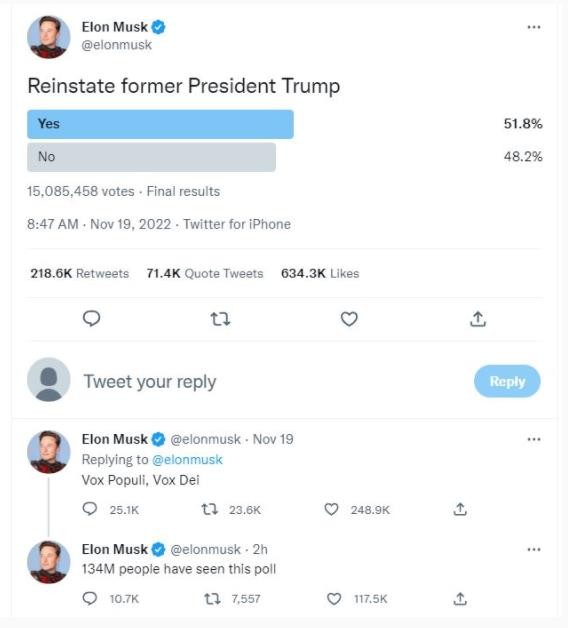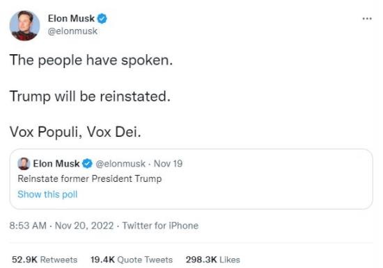在得到這一結果后,馬斯克發布消息,稱自己將根據網民們的意愿解封特朗普的個人賬號,他還用一句拉丁語格言表達了自己對這一決定的看法:Vox Populi, Vox Dei.(意為“人民的聲音就如同神的旨意”)。