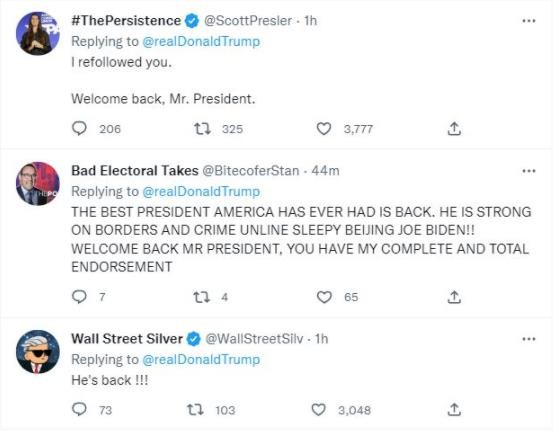 據筆者查詢,截至發稿時,特朗普的個人賬號已經恢復了正常展示的狀態,且已允許用戶轉發和評論,不少特朗普的支持者已經在評論區留言“歡迎回來”。