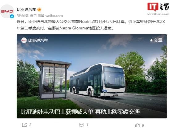 據(jù)比亞迪官微,近日,比亞迪與北歐最大公交運(yùn)營(yíng)商 Nobina 簽訂 64 臺(tái)大巴訂單,這批車(chē)輛計(jì)劃于 2023 年第二季度交付,在挪威 Nedre Glomma 地區(qū)投入運(yùn)營(yíng)。
