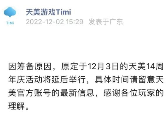 天美游戲公告,因籌備原因,原定于 12 月 3 日的天美 14 周年慶活動(dòng)將延后舉行,具體時(shí)間請(qǐng)留意天美官方賬號(hào)的最新信息,感謝各位玩家的理解。