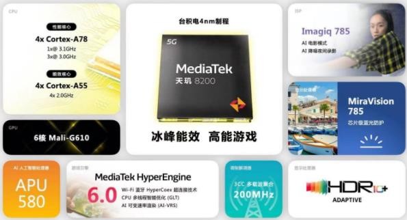 聯(lián)發(fā)科發(fā)布天璣 8200 5G 移動芯片,新品采用 4nm 制程,八核 CPU 架構(gòu)包含 4 個 Cortex-A78 大核以及 4 個 Cortex-A55 小核,最高主頻最高達 3.1GHz,搭載 Mali-G610 六核 GPU。