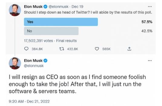 埃隆?馬斯克在推特發文對網友的投票結果作出回應,稱會盡快找到一個足夠傻的人來接任推特 CEO 一職,而一旦找到自己便辭職。馬斯克稱,辭任后他本人將只負責管理軟件和服務器團隊。