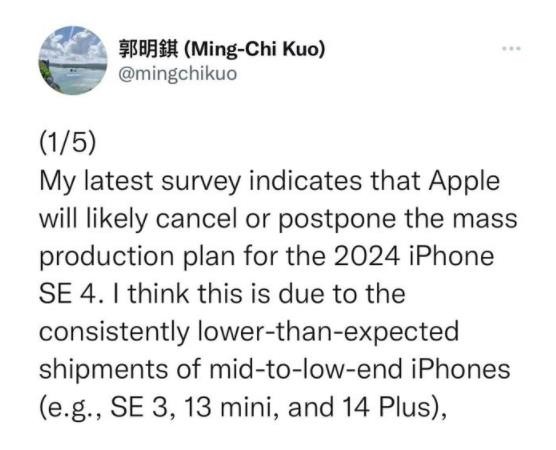 天風證券分析師郭明錤在個人社交賬號分享了關于蘋果的最新動態,按照iPhone 14與iPhone 14 Plus的實際市場表現來看,原定于2024年發布的iPhone SE第四代或許會被延期至2024年后,最壞的情況是終止項目的推進。據悉,iPhone SE第四代將采用劉海屏設計,徹底拋棄非全面屏造型。