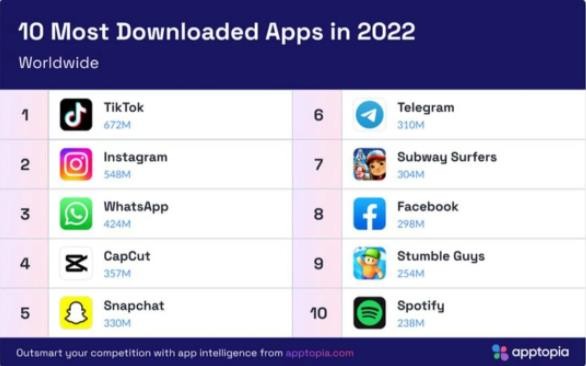 和 2021 年榜單有所不同的是,Subway Surfers 和 Stumble Guys 兩款游戲在榜單中表現強勁。瑞典音頻流媒體服務應用 Spotify 以 2.38 億次的全球下載量位居榜單第十位。