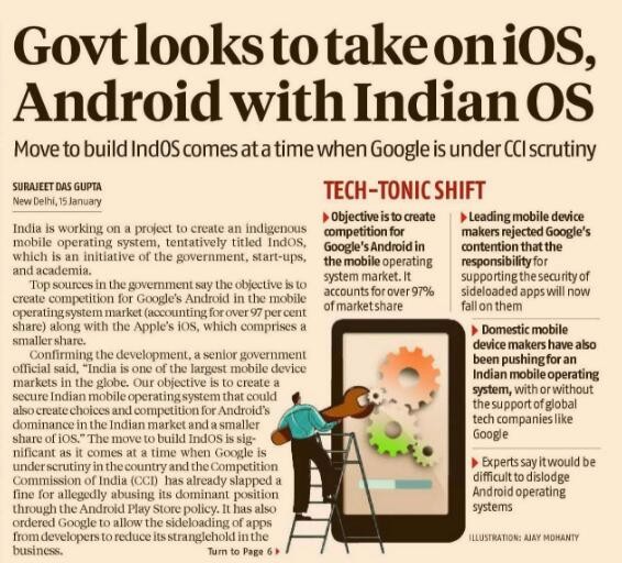 在印度移動操作系統(tǒng)中,蘋果的 iOS 和谷歌的 Android 兩家?guī)缀跽紦?jù)了所有份額。印度為了應(yīng)對這樣的危機,決定開發(fā)和推廣名為 IndOS 的系統(tǒng)。
