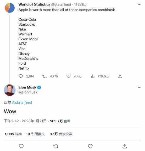 The World Of Statistics 在最新推文中表示,蘋果公司的市值已經超過了可口可樂、耐克等 11 家藍籌公司的市值總和。隨后馬斯克轉發了這條推文,并評論道:“WoW”。