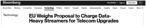 該提案是歐盟執(zhí)行機構(gòu)從“公平分享”(fair-share)的愿景出發(fā)提出的,該愿景要求提供流媒體視頻和其他數(shù)據(jù)密集型服務(wù)的大型科技企業(yè)幫助支付它們產(chǎn)生的流量。