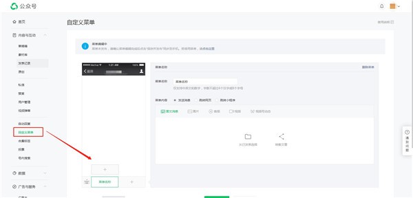2.進(jìn)入到公眾號(hào)后臺(tái)在左側(cè)菜單找到自定義菜單,點(diǎn)擊進(jìn)入就可以看到右側(cè)設(shè)置自定義菜單的位置。